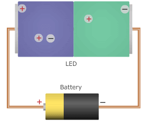 با برقراری جریان در داخل دیود نورانی LED، الکترون های آزاد ( – ) به مدار اتم های فاقد الکترون آزاد ( + ) سقوط می کنند و در نتیجه این سقوط مقداری انرژی به شکل فوتون نور مرئی یا نامرئی آزاد می شود.